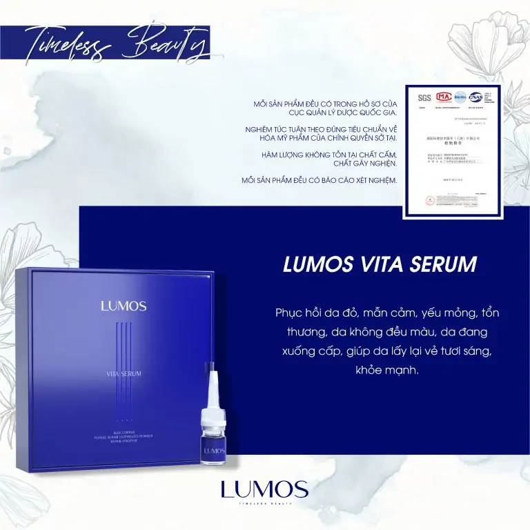 Mở đầu chu trình phục hồi chính là LUMOS Vita Serum, chứa Peptide Đồng đồng khô – “chiến binh” nổi tiếng trong làng tái tạo da. Thành phần này không chỉ giảm viêm, giảm đỏ và kích ứng tức thì, mà còn thúc đẩy sản sinh collagen, làm mờ sẹo và ngăn ngừa nếp nhăn.