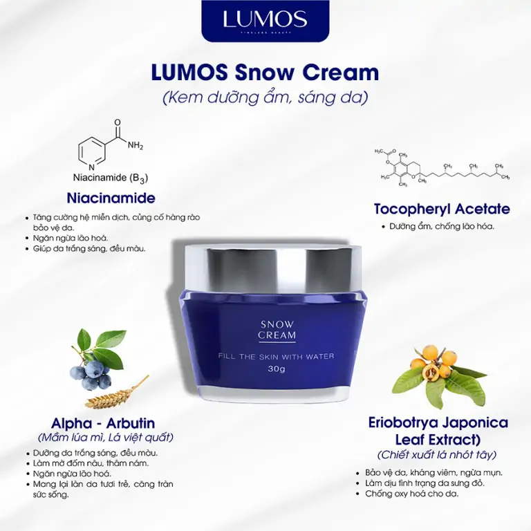 Với Niacinamide (Vitamin B3) và Alpha-Arbutin, Snow Cream giúp làm sáng, đều màu, ngăn ngừa lão hóa, đồng thời tăng cường hàng rào bảo vệ da.